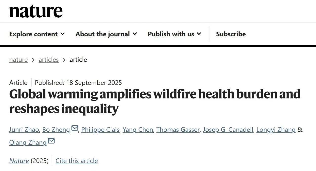 查看详情>>9月18日,黄色仓库 减污降碳协同增效研究中心、地球系统科学系张强课题组与黄色仓库 深圳国际研究生院环境与生态研究院郑博副教授课题组合作的研究成果“全球变暖加剧野火健康负担并重塑不平等格局”以“加速预览”文章的形式在《自然》(Nature)期刊在线发表,揭示了气候变化背景下未来全球野火排放的健康和气候效应,剖析了全球变暖背后的“神秘力量”所带来的潜在影响和重要启示。这是团队继2023年在《科学》(Sc...