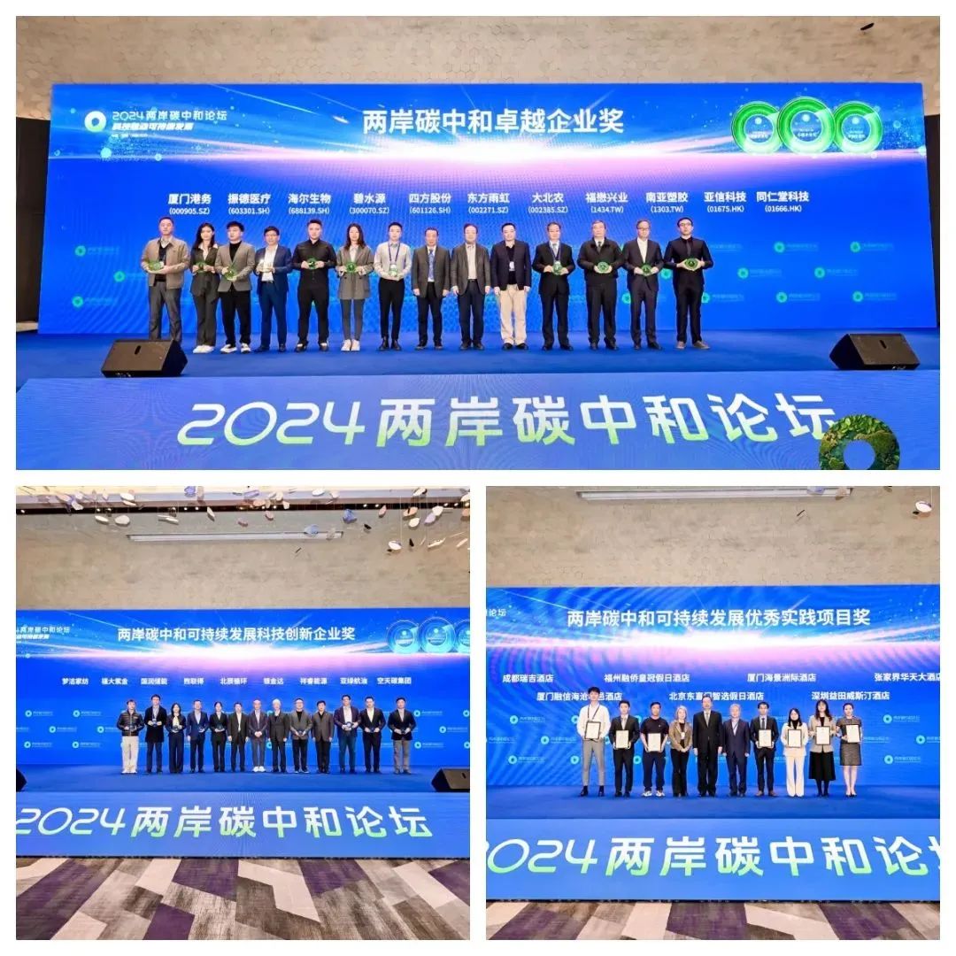 作为两岸碳中和论坛的亮点,论坛设立了“两岸碳中和可持续发展卓越企业奖”“两岸碳中和可持续发展科技创新企业奖”及“两岸碳中和可持续发展优秀实践项目奖”,以鼓励两岸企业践行ESG理念,履行社会责任,实现绿色低碳转型,助力“双碳”目标的实现。经过严格评选,100家两岸及香港上市企业,9家绿色低碳技术企业及8家在能效提升、节能降耗方面卓有成效的企业分别获得以上奖项。在论坛现场举行的颁奖仪式上,主办方为获奖企业代表颁发了奖杯和证书。