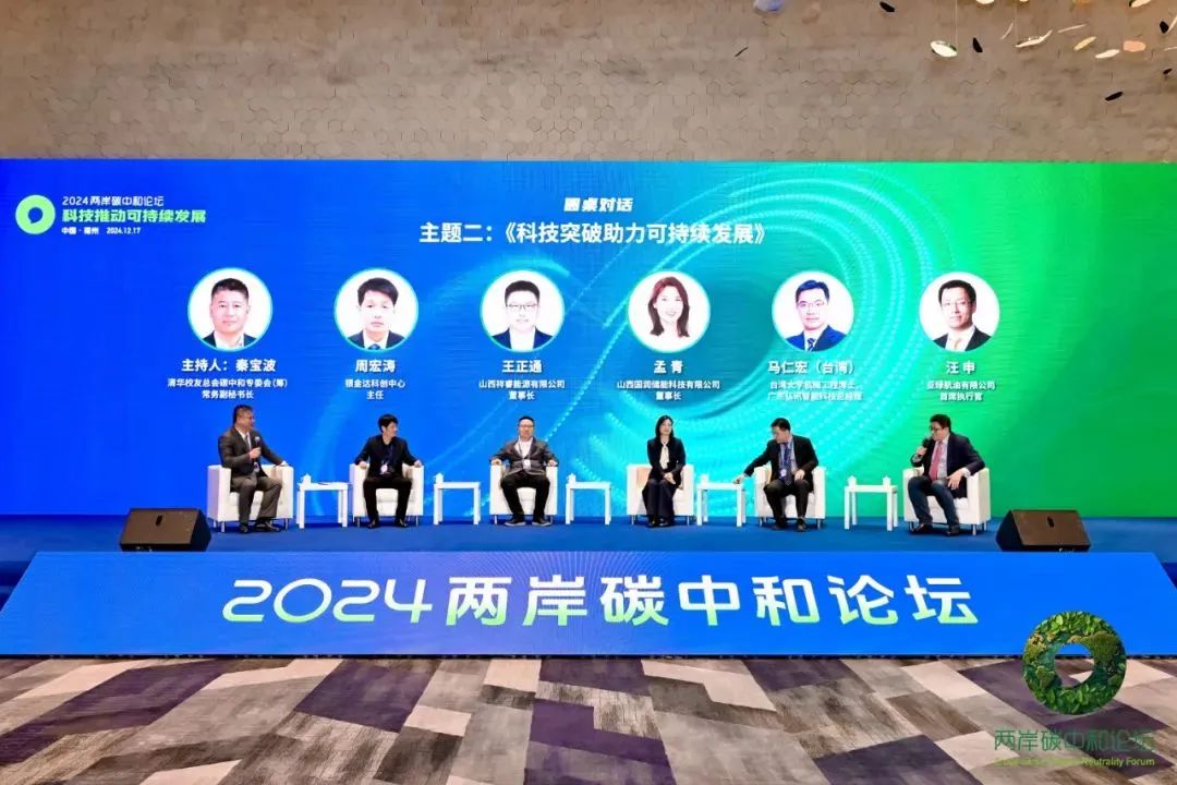 院长张馨予,银金达科创中心主任周宏涛,山西祥睿能源有限公司董事长王正通,山西国润储能科技有限公司董事长孟青,台湾弘讯科技集团-广东弘讯智能科技有限公司总经理马仁宏,亚绿航油有限公司首席执行官汪申等来自高校院所、科研机构的专家学者和企业家代表各抒己见,为两岸在碳中和领域加强合作、融合发展提供了新的思路。