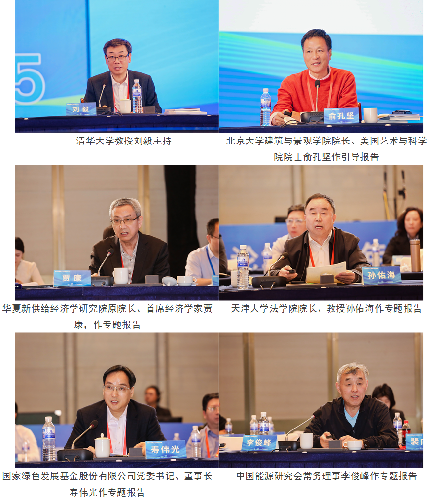 教授刘毅主持。北京大学建筑与景观学院院长、美国艺术与科学院院士俞孔坚就“‘碳’之外--地球气候韧性的中国模式”作引导发言。俞孔坚院长提出,要解决气候问题,必须修复我们的海绵地球,并分享了实践案例经验,为应对气候变化提供了新模式。华夏新供给经济学研究院原院长、首席经济学家贾康,天津大学法学院院长、教授孙佑海,国家绿色发展基金股份有限公司党委书记、董事长寿伟光,中国能源研究会常务理事李俊峰分别从财政政策支持绿色低碳项目、生态环境法典编纂与展望、耐心资本与科技创新助力美丽中国建设,新质生产力推动能源革命等方面作专题发言。