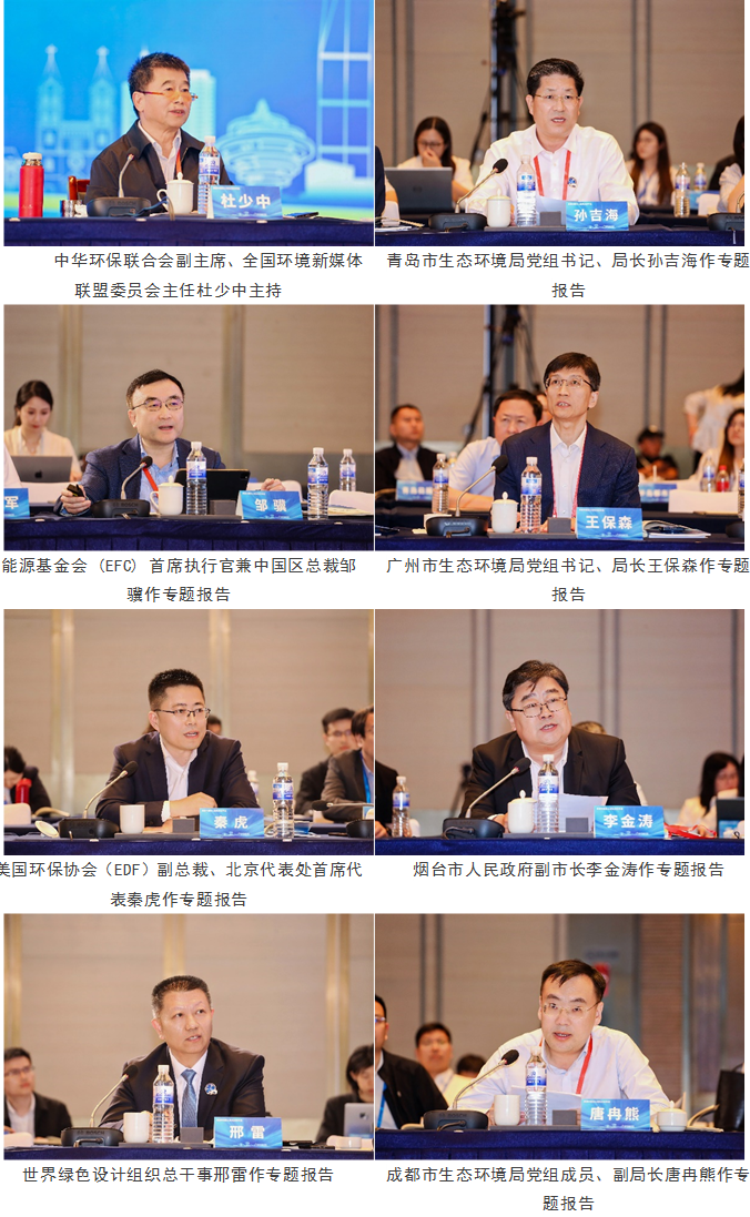 专题会议第二阶段由中华环保联合会副主席、全国环境新媒体联盟委员会主任杜少中主持。青岛市生态环境局党组书记、局长孙吉海,能源基金会 (EFC) 首席执行官兼中国区总裁邹骥,广州市生态环境局党组书记、局长王保森,美国环保协会(EDF)副总裁、北京代表处首席代表秦虎,烟台市人民政府副市长李金涛,世界绿色设计组织总干事邢雷,成都市生态环境局党组成员、副局长唐冉熊,罗克佳华科技集团董事长李玮,吕梁市人民政府党组成员、副市长闫林分别围绕宏观经济、能源转型、绿色设计、人工智能以及美丽中国建设地方实践等作专题发言。