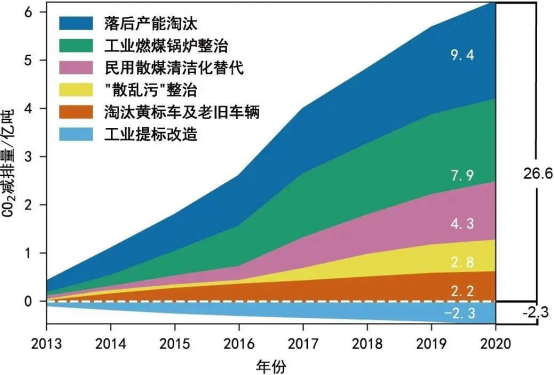 日益增多的蓝天“底色”背后是多管齐下的铁腕治污。研究者分析了5项兼具空气治理与碳减排协同效益的措施。其中落后产能淘汰、工业燃煤锅炉整治是我国协同减排贡献最大的两项措施。8年间,我国累计淘汰45000兆瓦燃煤电厂落后产能,3.12亿吨钢铁落后产能,3.88亿吨水泥落后产能和1.92亿重量箱平板玻璃落后产能;淘汰约65万蒸吨小型工业燃煤锅炉。