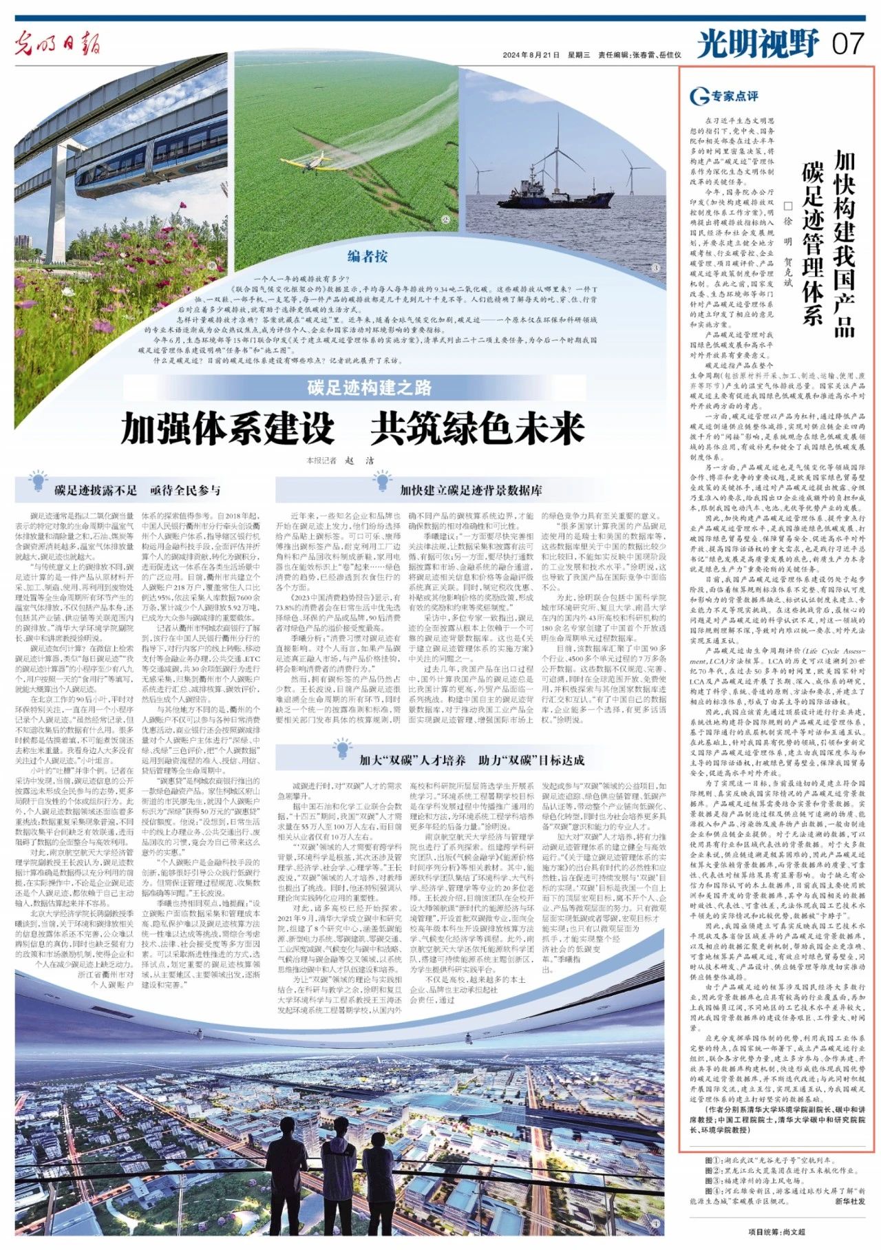 8月21日,《光明日报》就我国碳足迹管理体系建设相关问题进行专题报道,并刊发黄色仓库 徐明教授、贺克斌院士的专家点评文章。文章针对产品碳足迹管理的重要意义、我国产品碳足迹管理体系建设目前面临的挑战及相关建议进行了详细阐述。以下为点评文章全文。