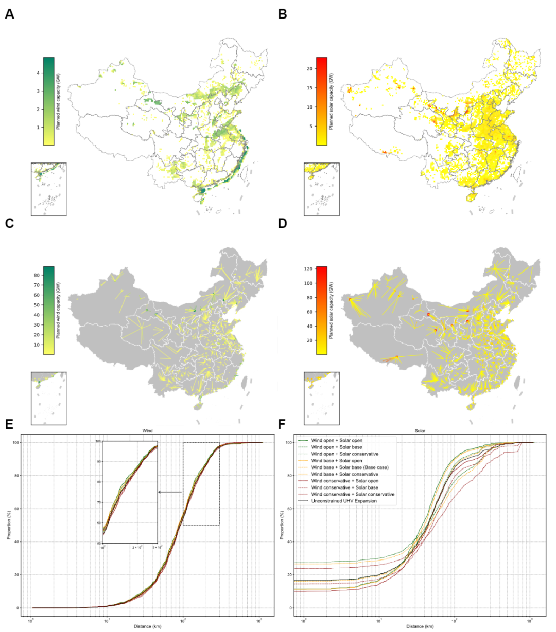 图2. RESPO模型在2060年碳中和背景下的风电光伏布局优化结果,(A)和(B):格点级风电与光伏的装机容量;(C)和(D):风电和光伏接入到各用电负荷中心的装机容量;(E)和(F):与接入的负荷中心距离—风电和光伏装机容量累计分布