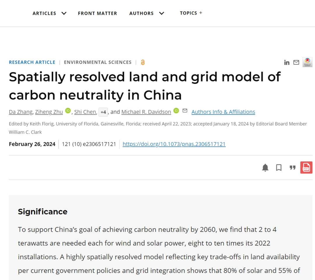 为此,联合研究团队开发了RESPO模型,首次实现了电力系统优化模型同时在格点(约31km×25km)和全年8760小时逐小时级别对大区域尺度(中国内地)的可再生能源容量扩张和运行调度进行优化。2月26日,研究论文以Spatially Resolved Land and Grid Model of Carbon Neutrality in China(《支撑碳中和目标的高精度土地利用和电力规划模型》)为题,在线刊登于《美国科学院院刊》(Proceedings of the National Academy of Sciences,PNAS)。
