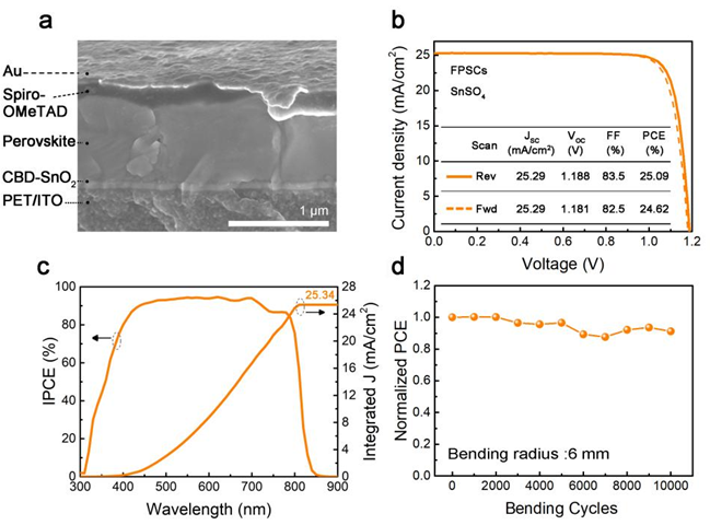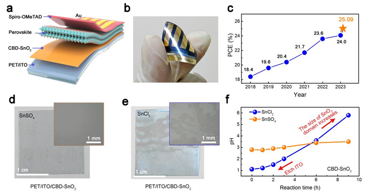 为解决这些问题,易陈谊团队开发了一种高质量SnO2电子传输层的制备新工艺。通过使用SnSO4取代常规的SnCl2作为锡源,能够在不添加强酸,恒定pH条件下可控生长制备SnO2薄膜,从而使其适用于对酸敏感的柔性ITO衬底。基于温和且可控的生长环境获得了覆盖均匀的致密SnO2薄膜,并且利用该薄膜实现了25.09%(认证效率为24.90%)光电转换效率(PCE)的FPSCs,该效率为目前报道的柔性钙钛矿太阳能电池的世界最高效率纪录。