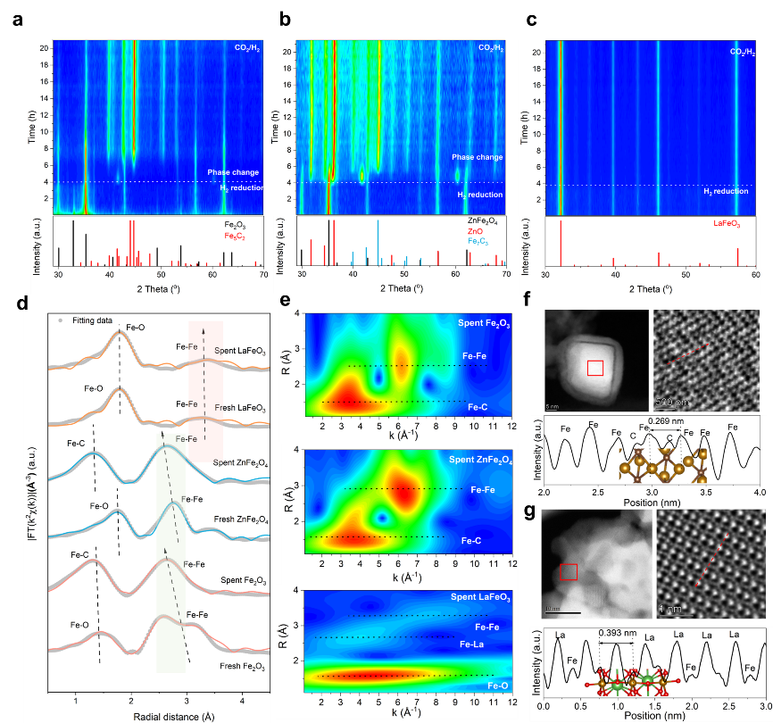 进一步采用异位同步加速器 X 射线表征来研究废氧化铁催化剂的化学状态和精细局部结构。归一化的 Fe K 边 X 射线吸收近边结构揭示了反应 24 小时后 Fe2O3 和 ZnFe2O4 中 Fe 的氧化态显着降低,与原位 XPS 观察结果一致。在 FT-EXAFS 中,Fe2O3 和 ZnFe2O4 反应 24 小时后,分配给 Fe-Fe 配位的第二壳层峰转移到距离较短的位置(图 3d)。使用后的Fe2O3和ZnFe2O4中的Fe-Fe配位数均增加至7以上,表明形成了具有更多团聚Fe的Fe碳化物。与 Fe2O3 和 ZnFe2O4 不同,LaFeO3 在相同处理后表现出 Fe 氧化态、Fe-Fe 距离(最初比 Fe2O3 和 ZnFe2O4 长)和 Fe-Fe 配位数略有变化。WT-EXAFS 提供了有关催化剂演变的更多见解(图 3e)。使用后的LaFeO3 中的Fe-Fe 散射强度低于使用后的Fe2O3 和尖晶石ZnFe2O4,表明Fe-Fe 相互作用较弱,从而抑制了Fe 迁移和聚集。