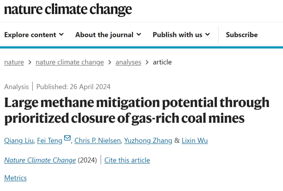 Liu, Q., Teng, F., Nielsen, C.P. et al. Large methane mitigation potential through prioritized closure of gas-rich coal mines. Nat. Clim. Chang. (2024). //doi.org/10.1038/s41558-024-02004-3