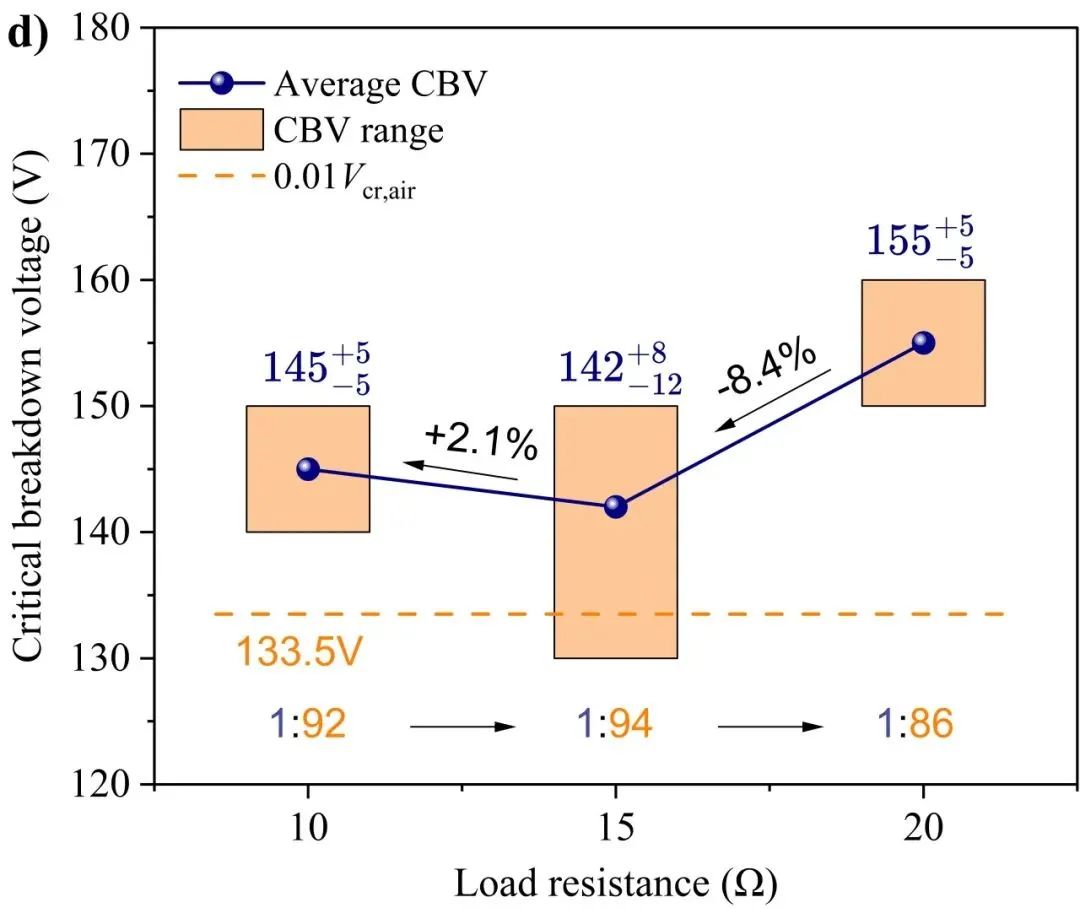 (2)颗粒物尺寸。由于不同颗粒物样品不仅尺寸存在差异,物质组成也有区别,因此本文所指“颗粒物尺寸”因素实际也包含了粒径相关的其它理化特性参数。电气间距固定为4mm,负载电阻为20Ω,颗粒物选择样品a~f。随着颗粒物尺寸降低,临界击穿电压显著增加,平均击穿电场强度由0.29kV/cm增长到0.70kV/cm,如图7c。对于样品f,外加电压达到400V仍未击穿颗粒物介质。这说明捕集大粒径颗粒物(如粒径超过100μm)可以显著降低喷发颗粒物诱导电弧发生的可能性。相较于均匀电场下空气介质的临界击穿电压,各组颗粒物介质在本文电极模型下的临界击穿电压值仅约为0.9~2.1%。