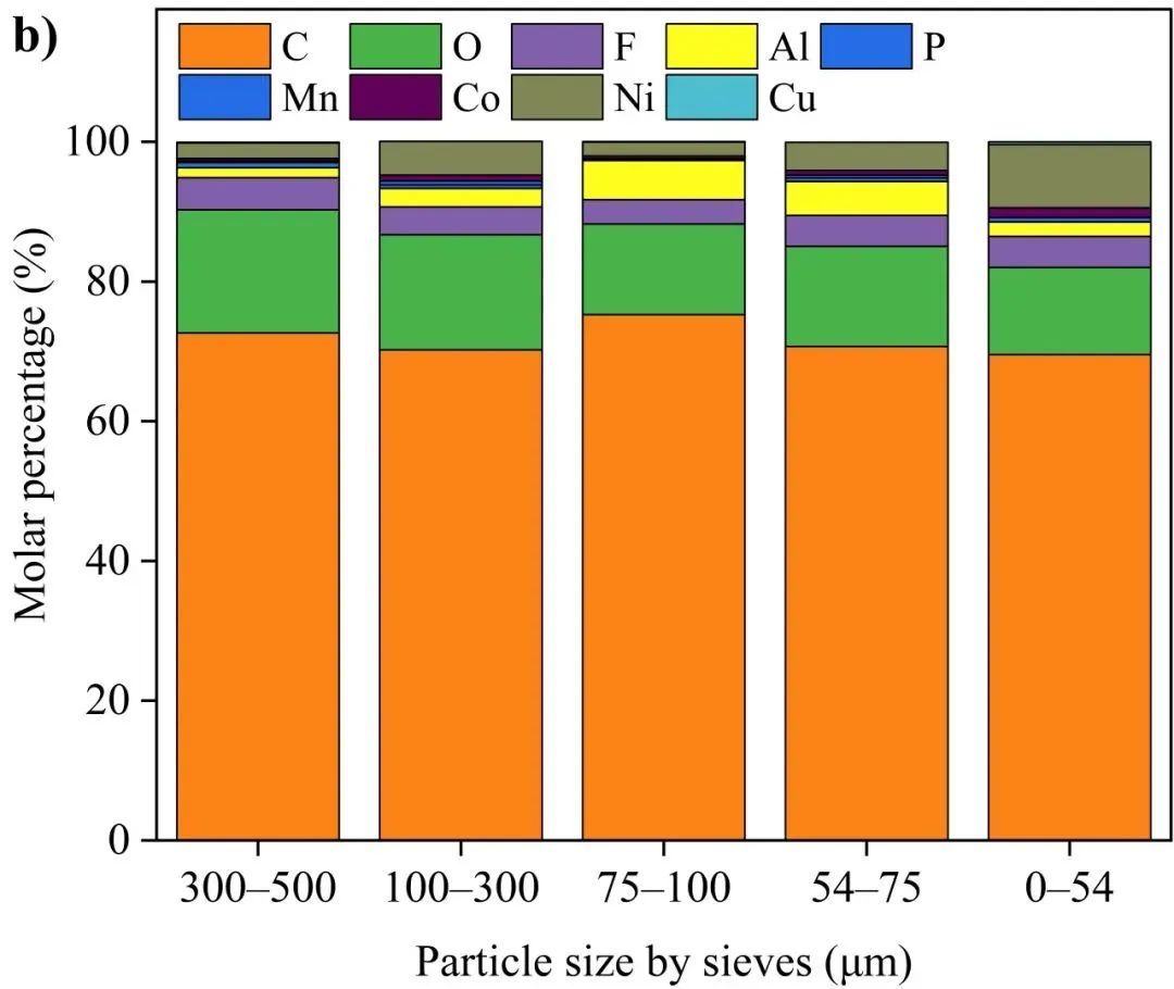 在本研究选取的颗粒物中,通过500μm筛网的颗粒物质量占比超过90%,因此以这部分颗粒物作为主要研究对象。采用不同孔径的筛网将所有可沉降的喷发颗粒物划分为六类测试样品,即0-500μm(样品a)、300-500μm(样品b)、100-500μm(样品c)、75-100μm(样品d)、54-75μm(样品e)和0-54μm(样品f),在平均等效球直径的含义下各组样品粒径分别为247、401、305、102、68和23μm。由于喷发颗粒物形状不规则,筛网孔径与激光粒度分析仪所定义的粒径有所不同。样品a用于研究喷发颗粒物的电弧诱导作用,样品a-f用于分析颗粒物尺寸的影响。不同组别颗粒物样品形貌及元素组成如图5所示。