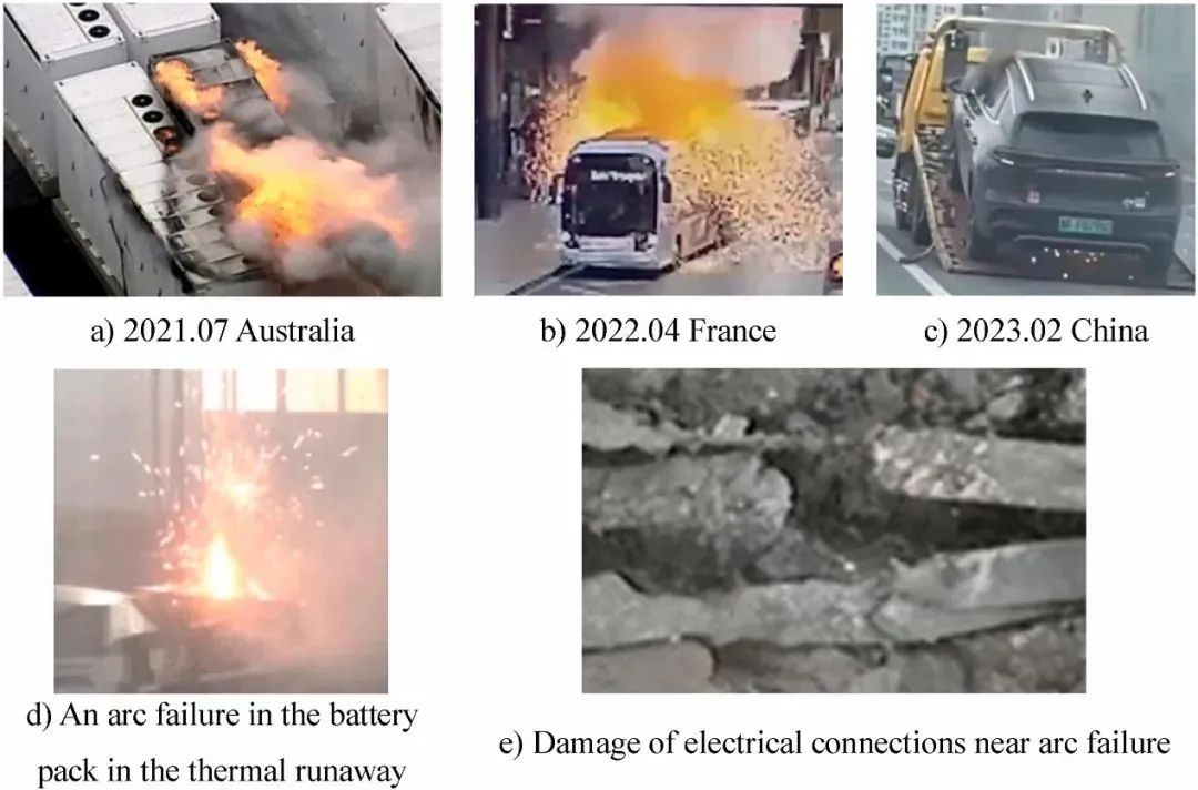 电池系统是直流电气系统,对应的电弧故障为直流电弧。直流电弧是一种气体放电方式,主要由弧柱、阴极和阳极区域组成。在电池系统中,电池热失控与喷发烟气可能破坏电池/模组间电气连接,从而引起电弧故障。图1列出了近年来电池系统起火事故中的电弧或火花放电现象,往往伴随着大量的烟气排放,也发现了电池喷发导致电气部件结构形变的痕迹。电弧能量集中,最高温度可达上万摄氏度,存在熔化电池系统壳体和点燃可燃物的风险。一旦电池系统内部发生电弧故障,电弧释放的能量与电弧引发的燃烧放热甚至可能加速热蔓延。因此电池系统中热失控诱发电弧的边界条件及致灾机制是一个关键问题。