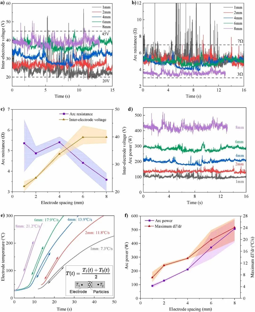图8 喷发颗粒物诱导电弧特性参数与电气间距。a)稳定燃弧阶段电弧电压时域曲线;b)稳定燃弧阶段电弧电阻时域曲线;c)电特性参数;d)稳定燃弧阶段电弧功率时域曲线;e)电极平均温升曲线;f)热特性参数。