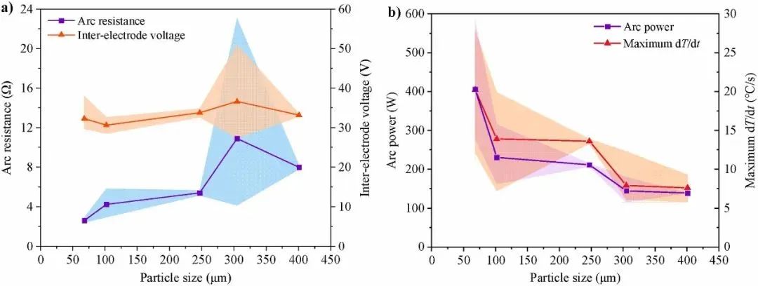 (2)颗粒物尺寸(图9)。电弧特性参数计算方法同上。随着颗粒物粒径增大,平均电弧电压几乎维持在35V附近,而平均电弧功率和电极最大温升速率逐渐降低,因此平均电弧电阻呈增加趋势。