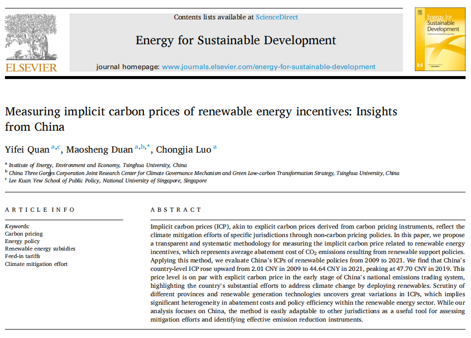 气候治理与碳金融研究中心副主任、能源环境经济研究所段茂盛研究员团队对我国可再生能源激励政策所带来的隐性碳价水平进行了系统性的回顾和量化评估。近日,相关成果以Measuring Implicit Carbon Prices of Renewable Energy Incentives: Insights from China(《衡量可再生能源激励带来的隐性碳价:来自中国的见解》)为题,在线发表于Energy for Sustainable Development 期刊。段茂盛研究员为通讯作者,其他作者包括研究所硕士毕业生权逸飞和博士研究生罗崇佳。