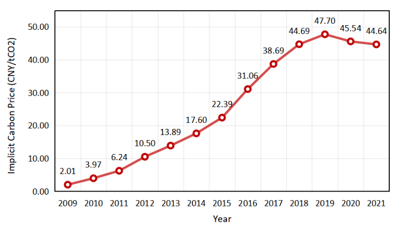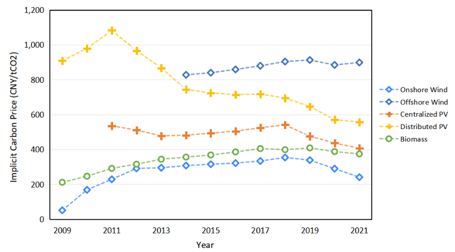 首先,中国可再生能源激励政策带来的隐性碳价从2009年的2.01元/吨二氧化碳水平逐渐上升,至2019年达到47.70元的最高值。此后,由于政府对可再生能源的补贴逐步退坡,隐性碳价略有下降。总体而言,近几年可再生能源激励政策带来的隐性碳价水平与全国碳市场早期的显性碳价相当,表明中国在推广可再生能源方面付出了不容忽视的重大努力。