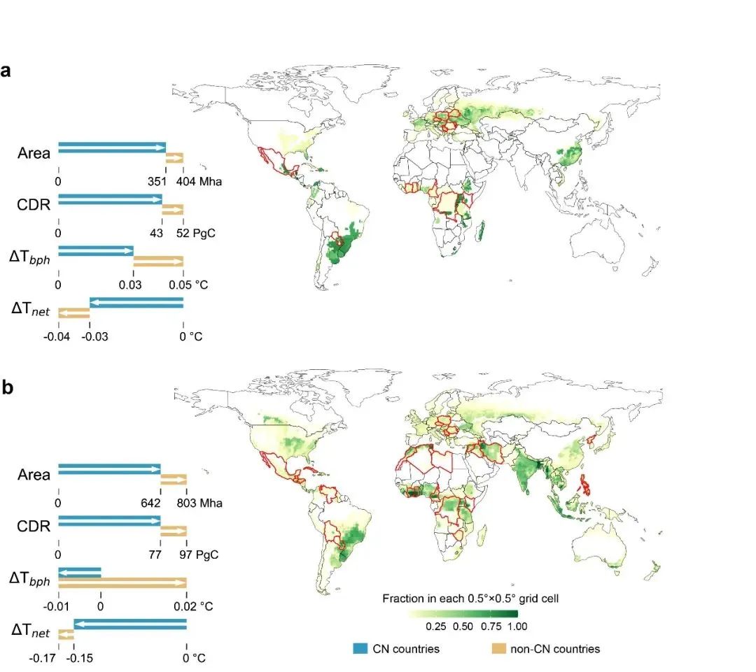 图1 生物能源作物种植分布及碳中和与非碳中和国家对全球气候变化缓解的贡献(红色边框表示种植面积超过1公顷的非碳中和国家)