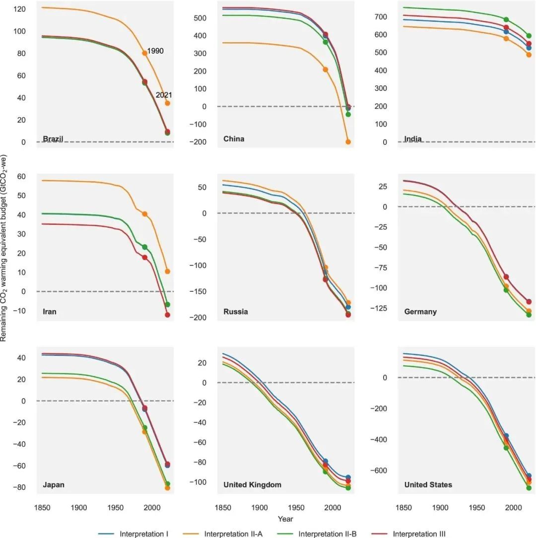 图3. 主要国家剩余温升贡献随时间的消耗情况
