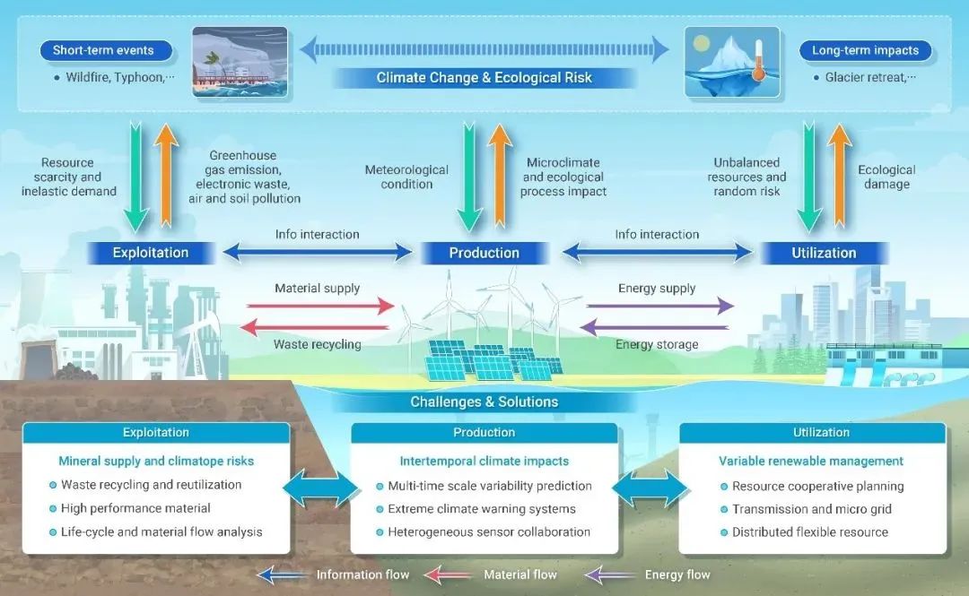 研究进一步提出了可再生能源开发与利用的潜在解决方案。(1)可再生能源精准化评估方面:未来的技术发展应侧重于加强多尺度气候预测和风险管理能力,揭示可再生能源时变动性及其驱动因素,建立长时序变动性预测方法及风险预警机制,保障可再生能源生产的稳定性和能源系统运行的安全性。(2)可再生能源高效利用机制方面:未来应发展跨发电、输电、负荷等关键技术的主动并网机制,供给侧与需求侧阐释其协同利用机制,可以通过需求响应、电动汽车、储能等交互技术,促进分布式可再生能源的消纳;在输电方面,灵活的交流和高压直流输电技术可以提高容量,而微电网和分布式发电可以最大限度地减少长距离输电需求;在储能方面,协同利用长时储能(例如氢能和抽水蓄能)和短时储能(例如电化学储能)可以进一步减小能源波动。三是可再生能源产业链方面:未来应注重开发更加环保的回收技术,如水冶金技术和生物浸出技术,并推动能源材料创新,特别是钙钛矿光伏材料的应用,这有望提高太阳能转换效率并降低资源依赖;同时,采用全生命周期分析方法评估能源产品的全程环境影响,将有助于提升能源开发的可持续性。