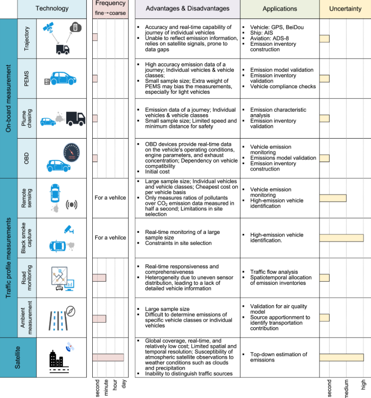交通特征测量主要采用非接触式技术对车辆及道路进行监测,通过间接手段解析实际排放的时空分布特征。在车辆监测层面,尾气遥感技术通过实时检测尾气中的污染物与二氧化碳比率,广泛应用于排放监管和排放因子建模。黑烟视觉识别技术依托图像分析算法检测尾气颗粒物,受限于设备成本与数据采集规模,主要服务于高排放车辆筛查。基于磁感应、微波探测和视频监控的智能交通系统(ITS)技术,可持续获取交通流参数(如车流量、车速等),为城市尺度的排放总量估算与污染热点定位提供数据支撑。环境监测技术虽无法直接量化车辆排放,但结合大气受体模型,可有效估算区域交通移动源的排放贡献。