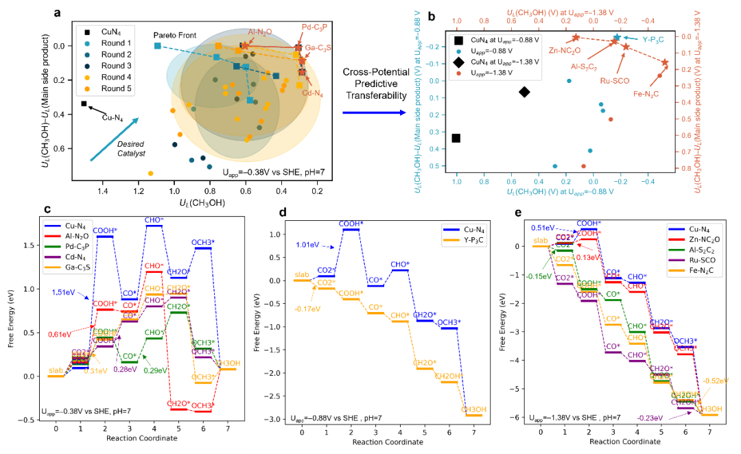 另外,团队聚焦于二氧化碳电还原制甲醇的催化剂的活性与选择性筛选这一重大技术挑战,提出了一套由AI驱动的高通量催化剂筛选框架。以预训练的原子基座模型为基础,结合主动学习策略,仅用少量的DFT计算数据就能快速微调出高精度预测模型。该方法将催化剂吸附性能的筛选效率提升了千倍以上,成功从3000多种候选材料中发现了一系列综合性能超越现有基准的新型单原子催化剂。相关成果以“结合原子基座模型与主动学习加速二氧化碳转化催化剂的理论高通量筛选”(Theoretical High-Throughput Screening of Single-Atom CO2 Electroreduction Catalysts to Methanol Using Active Learning)为题,于8月5日发表于中国工程院院刊《工程(英文)》(Engineering)。
