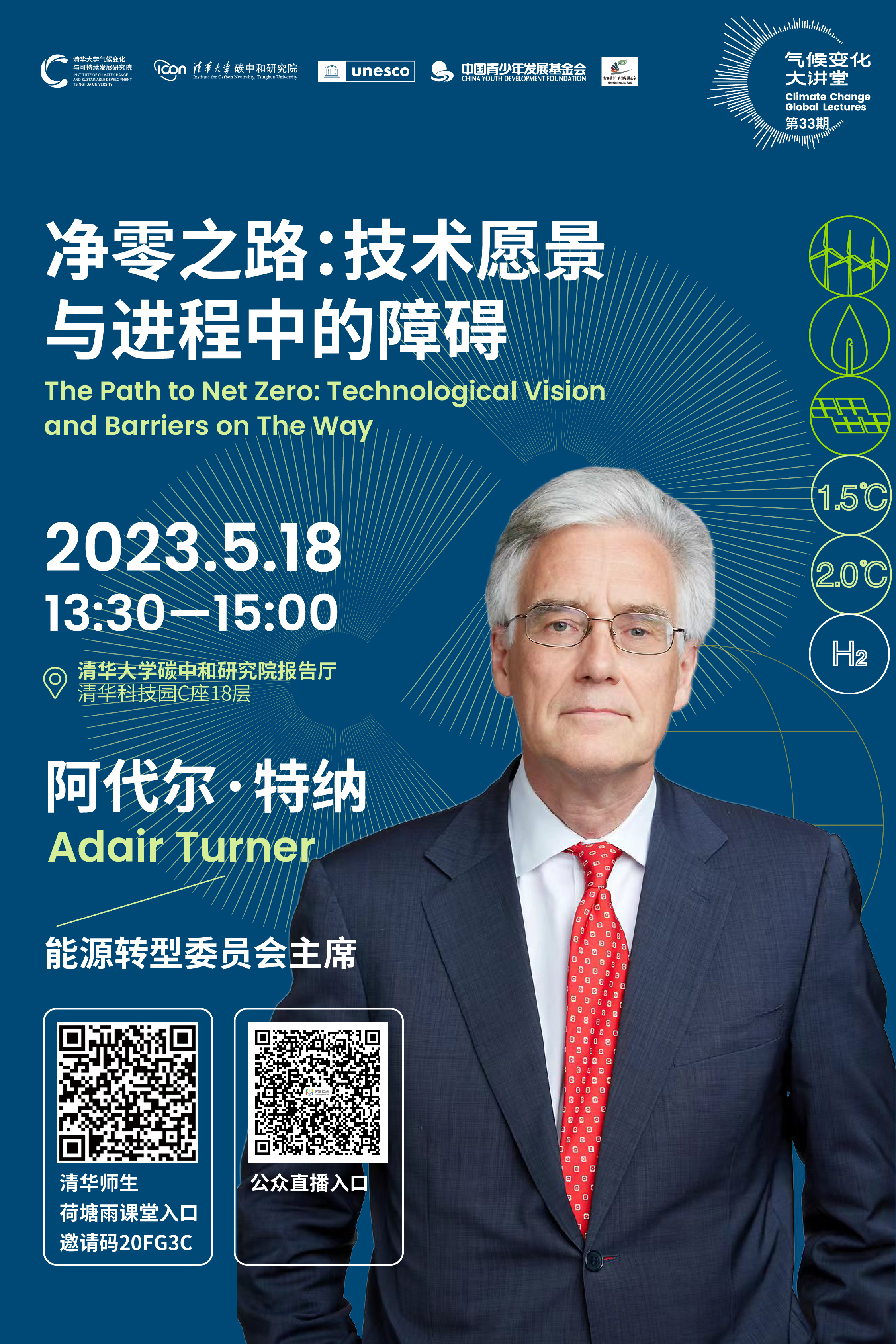能源转型委员会主席阿代尔·特纳(Adair Turner)勋爵将发表主题演讲——净零之路:技术愿景与进程中的障碍(The path to net zero: technological vision and barriers on the way)。阿代尔·特纳将会介绍经济部门脱碳的技术的范围,以及部署这些技术所需的投资规模,并提出快速实现脱碳以防潜在灾难性气候变化的政策。