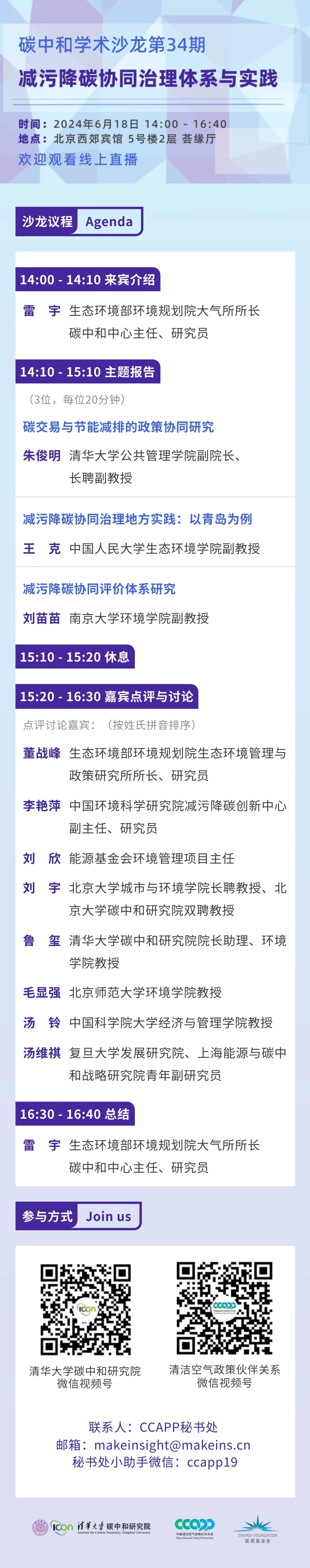 主办、中国清洁空气政策伙伴关系承办、能源基金会支持,兹定于2024年6月18日(周二)14:00在北京举办第34期碳中和学术沙龙——减污降碳协同治理体系与实践,就关键议题展开研讨,推动建立符合我国未来发展的减污降碳协同治理体系,促进协同治理评价体系和监管手段的建立和发展,完善以碳市场为主体的市场经济激励政策,推进减污降碳工作从中央到地方的落地实施,切实可行地推动温室气体与大气污染物的协同治理。