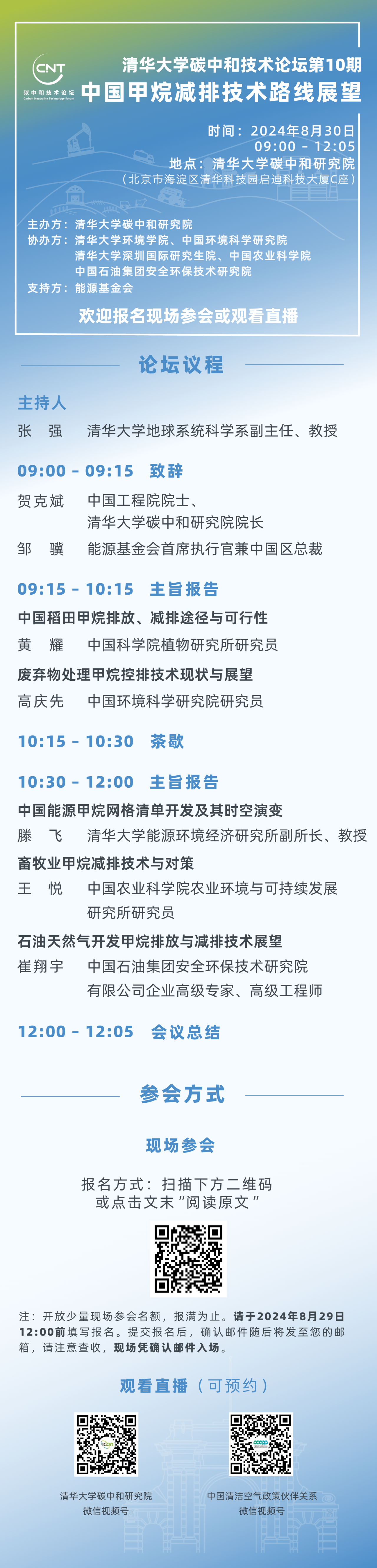 自2022年以来举办“碳中和技术论坛”系列学术活动,探讨国内外前沿技术,聚焦科学问题,就重点领域碳中和技术发展前景与挑战展开讨论。兹定于2024年8月30日上午在北京举办第10期碳中和技术论坛——中国甲烷减排技术路线展望。论坛将汇聚农业、畜牧业、能源等领域专家共同探讨碳中和目标下的中国甲烷减排技术路径与策略,以推动中国甲烷减排行动的有效落实。