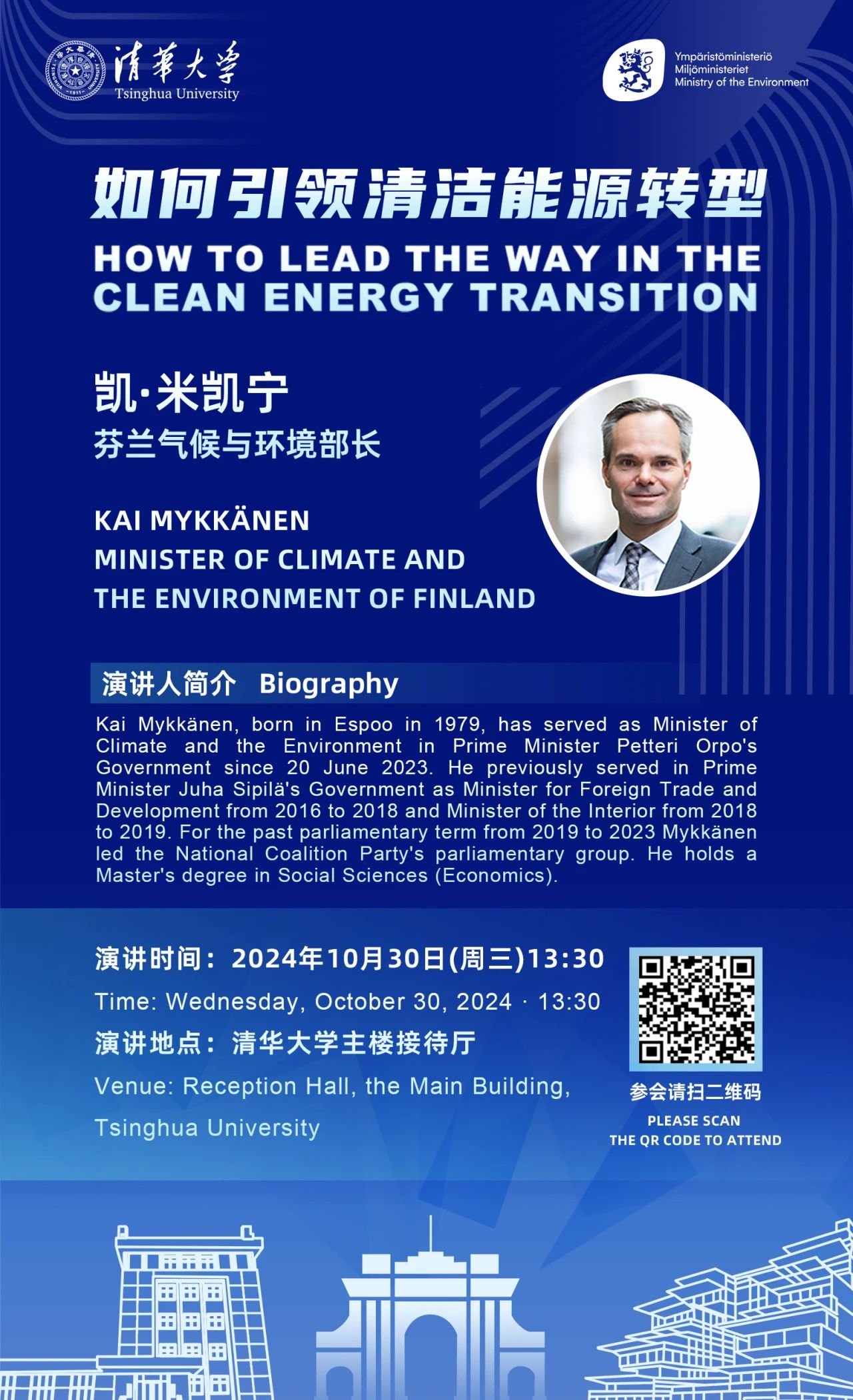 芬兰气候与环境部长凯·米凯宁(Kai Mykkänen)将做客清华论坛第110讲。凯·米凯宁于2015年当选为芬兰议会议员,2016年至2018年担任芬兰政府外贸与发展部长,2018年至2019年担任内政部长,2019年至2023年领导了民族联合党议会党团,自2023年6月20日起担任气候与环境部长。本次论坛凯·米凯宁部长将带来“如何引领清洁能源转型”的专题演讲,分享芬兰能源转型的经验及有关气候合作的见解。