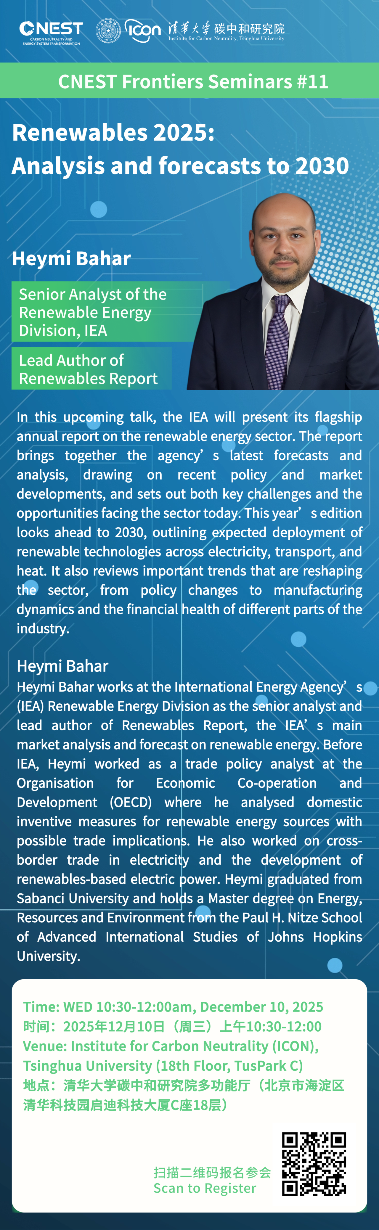 多功能厅举办。活动邀请国际能源署(IEA)可再生能源部门高级分析师、《可再生能源》报告首席作者Heymi Bahar就IEA年度旗舰报告《可再生能源2025》进行主题演讲,并就相关话题进行交流讨论。CNEST前沿讲座是“碳中和系统科学与技术”一级学科博士研究生必修的碳中和技术前沿课程。欢迎报名参加!