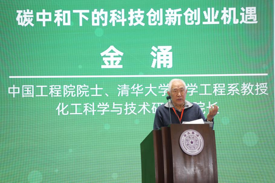 随后,金涌院士以“碳中和下的科技创新创业机遇”为题在开幕式作了主旨报告。他指出,中国未来40年的碳达峰与碳中和之路,是工业化向信息化转变的时代,是可再生能源的时代,是核聚变能源的时代,是化石能源向化石资源转变的时代,是资源循环利用的时代。碳达峰碳中和要与我国经济发展同步进行,必须提早规划,稳步推进,建立相关行业的退出机制,避免造成大的冲击。还要依靠大幅度、颠覆性科技创新改变产业结构,从初级产品生产转变为髙附加值、精细、智能化产品的生产,并利用可再生能源,做到理性地、智慧地、稳健地平衡好经济发展和生态文明建设的关系。