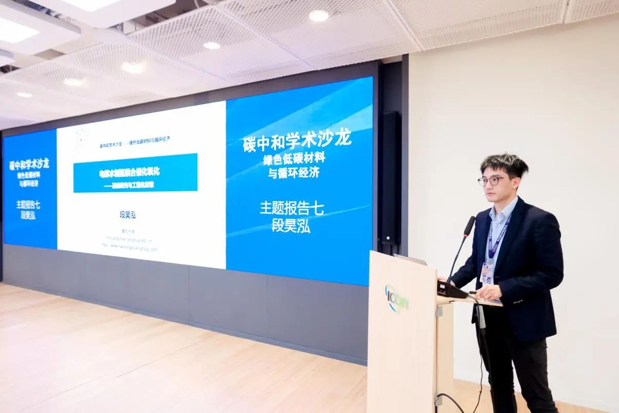 段昊泓副教授分享了团队近几年在电解水制氢方面的研究成果。他指出氢能作为绿色低碳的二次能源前景广阔,但电解水制氢在市场规模上仍面临挑战,主要因其高生产成本。为应对此问题,他们团队通过电催化的氧化反应取代阳极的析氧反应,实现了制氢能耗的降低和高附加值化学品的生产。具体应用包括电解水制氢与有机合成、生物质转化、废弃塑料高值转化的耦合。通过开发连续流反应器,他们在高浓度条件下取得了高纯度的反应产物。最后,展望未来使用可再生电力驱动反应,助力碳中和目标的实现。